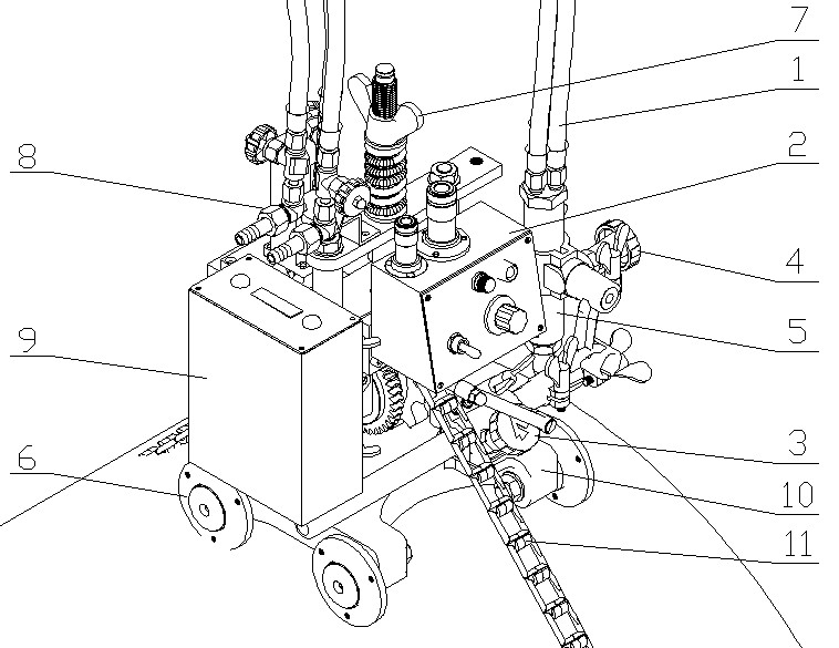 2.電器箱 3.橫向進(jìn)給旋鈕:改變割炬水平位置 4.割炬升降手輪:調(diào)節(jié)割炬高度。 5.割炬:切割厚度:5~50mm 6.滾輪:通過四只滾輪使機(jī)器在管壁平穩(wěn)運(yùn)行 7.大翼形螺母:擰緊該旋鈕,將逐漸收緊鏈條,可使機(jī)器牢固的固定在管子上。 8.氣體分配器:可將氣體分為預(yù)熱氧、快氧、切割氧 9.鋰電池 10.主體部件 11.鏈條:裝置沿導(dǎo)軌方向隨鏈條傳動(dòng)而運(yùn)行 |