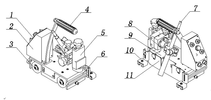 9. 底座 10.導(dǎo)向輪:沿著母材面滾動,引導(dǎo)準(zhǔn)確焊接部位的裝置。 |
